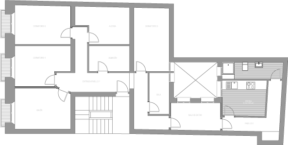 El salón y los dormitorios se encontraban en fachada, mientras que la cocina estaba situada al fondo de la vivienda, alejada de la zona de estar. Anexo a la cocina había un pequeño aseo, respondiendo a la distribuciones de la época donde las zonas de servicio se encontraban al fondo de las casa.