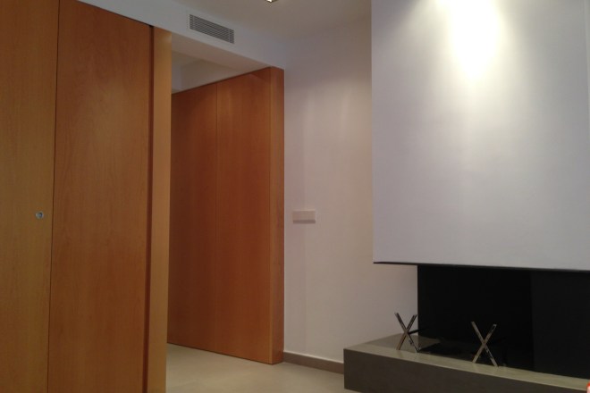 En el salón se proyectó una cocina, oculta tras unos paneles de madera, y se sustituyó la antigua chimenea por otra más moderna donde se proyectó una zona de almacenaje.